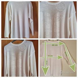 Fattura originale made in Italy anni 80, la maglia si presenta sobria ed elegante, a girocollo, spalle scese e lunghezza ai fianchi.