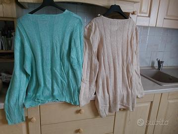 Vendo a € 3 al pezzo maglioni a manica lunga a coste in cotone con girocollo taglia L. 1 - color acqua marina 2- color beige impreziosito di roselline di stoffa sul davanti ideali da portare sopra una camicia o come maglia
