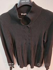 Maglia nera in lana. Aperta sul davanti. Chiusa con una fila di bottoncini fino a metà poi lasciata aperta