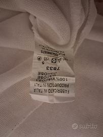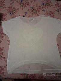 🌸Bellissima t-shirt bianca a maniche corte, leggera e morbidissima sulla pelle, realizzata interamente in 100% viscosa. Il design è caratterizzato da un elegante scollo a V e da un dettaglio frontale con due cuori intrecciati ricamati in paillettes argento, perfetti per dare un tocco di luce al look. ✨ Dettagli del capo: Composizione: 100% Viscosa (tessuto fresco, traspirante e cascante). Taglia: Unica (veste bene da una S a una L grazie al taglio morbido/oversize). Taglio: Asimmetrico (più corta davanti e leggermente più lunga sul retro). Condizioni: Ottime, come nuova. Produzione: Made in Italy.
