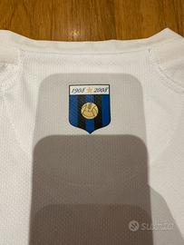 Maglia Inter Centenario 1908-2008, taglia M, condizioni ottime. La maglia è edizione limitata e da collezione perché riporta i due ormai famosi errori commessi da Nike nell’etichetta celebrativa del centenario. L’etichetta riporta infatti una data errata (8 marzo 1908 invece che 9 marzo 1908) e l’errore grammaticale 100 ANNI NEROAZZURO (invece che 100 ANNI NEROAZZURRO).