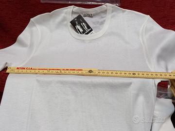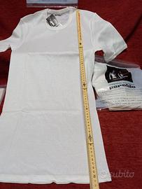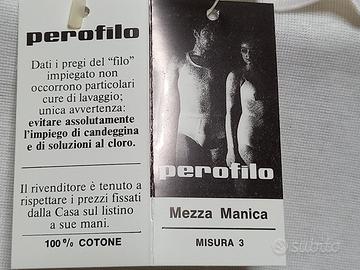 Maglia intima per uomo mezze maniche. Perofilo Lotto di 2 Maglie intime a mezze maniche di colore bianco con collo circolare al 100% di cotone. Nuove ancora nella loro confezione originale. Misura 3: Lunghezza cm 70 . Larghezza 35 cm. Prezzo: € 17 per ogni singola maglia. Prezzo € 29 per entrambe le magliette