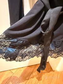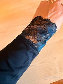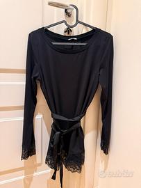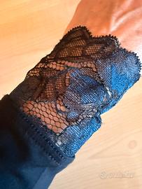 Maglia intimissimi di cotone pettinato con bordi in pizzo raffinato sulla gradazione blu nero con cinturina che avvolge la vita lunghezza sotto coscia collo girocollo cadenza morbida tg s/m