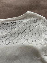 Maglia invernale da donna, caldisdima e morbidissima, con un elegante dettaglio in pizzo e volant sul décolleté. La maglia è perfetta, come nuova. Purtroppo è stato tagliato il cartellino con la composizione e la taglia ma sicuramente c’è lana di qualità per la morbidezza unica che presenta. Maglia sottile che può stare anche sotto una giacca. Misure ( penso sia una taglia centrale come una M lunghezza cm 56, da ascella ad ascella cm 42, vita nel punto più stretto cm 37 e manica cm 60. Non infeltrita, non ingiallita o altro difetto