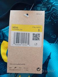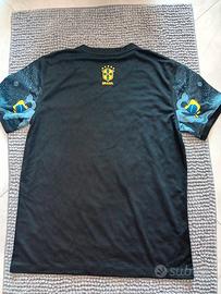 Questa maglia è un mix tra streetwear e ispirazione brasiliana: presenta una grafica scura con l'immagine stilizzata del Cristo Redentore, logo Stüssy al centro, simbolo CBF con cinque stelle, e dettagli Nike in giallo. I toni sono scuri con accenti gialli, verdi e bianchi, e la stampa è ricca di elementi artistici e culturali.