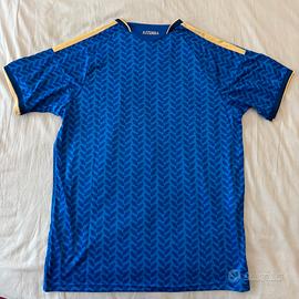Maglia della nazionale italiana colore azzurro con elegante pattern grafico tono su tono su tutta la superficie. Logo frontale e stemma Italia con dettagli dorati sulle spalle.