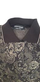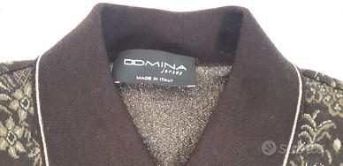 Maglia a maniche lunghe di jersey firmata Domina, color marrone con disegni a fiori in oro, taglia 50, praticamente nuova. La maglia è più scura di quanto risulta nelle foto. Scollo a V con colletto. Chiusura con bottoni.