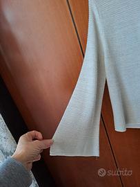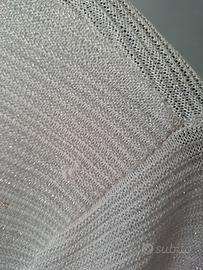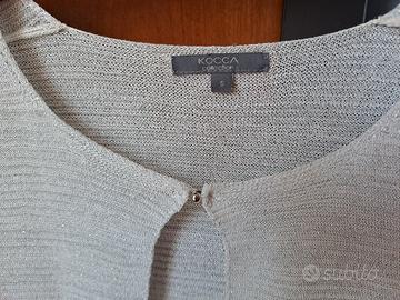 Maglia Kokka manica lunga aperta sul davanti. Misto viscosa, trama a coste sottili in filo lurex argento. Tg.S Capo estremamente versatile, ideale come raffinato coprispalle per abiti da cerimonia o per completare look quotidiani . Evidenzio un piccolissimo difetto sulla spalla dx. come da foto Ben conservato, vendo a 16 euro