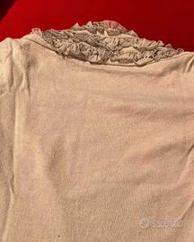 A maniche lunghe e con un ampio scollo squadrato, l'elemento distintivo è l'applicazione di volant di maglina che decorano interamente il girocollo e le spalle, creando un effetto sciallato molto femminile. I bordi (collo, fondo e maniche) sono rifiniti a costine sottili.