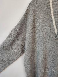 Maglia scollo a V con bordi a coste e righe bianche, tessuto misto lana, motivo con logo LIU JO in rilievo e con strass, in ottime condizioni, manica ampia e scesa, taglia L, spalle cm 60, manica cm 55, lunghezza cm 700