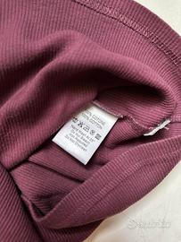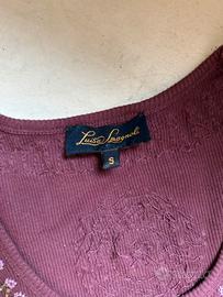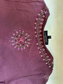 maglia a coste color prugna con decorazioni di perline e paillettes sul décolleté, prodotta dal marchio Luisa Spagnoli.