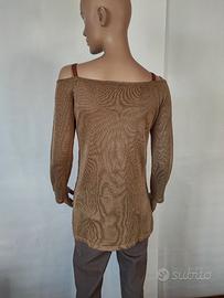 Maglia donna Luisa Spagnoli manica lunga con spalle scoperte, colore dorato, tessuto misto viscosa, spacchetto sui fianchi, made in Italy, taglia S, misura da ascella ad ascella cm 41, manica cm 50, lunghezza cm 65, in ottime condizioni