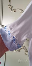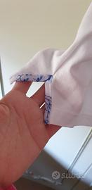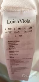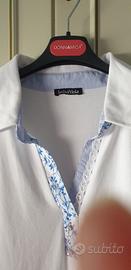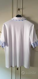 Maglia Luisa Viola Nuova taglia calibrata 43F di colore bianco con rifiniture color celeste con il colletto e spacchetti laterali. Misure: spalle 50, seno 68cm, lunghezza dal collo a fine maglia 70cm, larghezza della manica 18cm. No scambio e disponibile per ulteriori informazioni e foto.