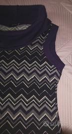Maglia lunga donna smanicata a motivi geometrici in acrilico ed elastane senza maniche colori viola/nero/bianco/grigio, collo a ciambella viola in tinta unita, taglia M (veste piccolo), ottime condizioni.