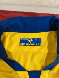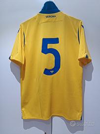 maglia Macron Hellas Verona 100% poliestere gialla inserti blu maniche corte con logo Hellas Verona nr 5 taglia M