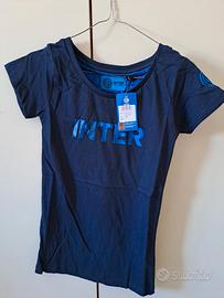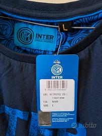Vendo nuova in confezione originale maglia manica corta a girocollo Inter da donna taglia L lunghezza 60 cm x 35 cm larghezza. 100% cotone.