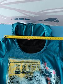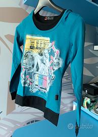 Carinissima maglietta donna taglia S con cappuccio. La particolarità non sta solo nella presenza del cappuccio, ma soprattutto nel fatto che appare come se fossero 2 magliette, una sopra l'altra, anche se la maglietta interna (di colore nero) arriva solo fino a sotto il seno. Capo davvero molto molto bello. Colori: verde petrolio (ottanio) e nero, con stampa e strass sul davanti. 90% cotone. Date un'occhiata ai miei annunci: se vi piace più di un articolo chiedetemi di comporre un set e potrete così risparmiare sulle spese di spedizione!