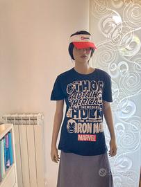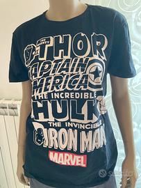 Maglia marvel taglia M,misure: spalle cm.45,da ascella ad ascella cm.56,lunghezza cm.70,sfondo nero indossata pochissimo.