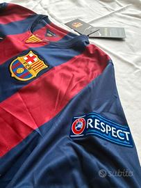 Design classico blaugrana con patch UEFA “Respect” e patch Champions League sul braccio.