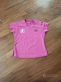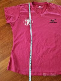 Maglia in tessuto tecnico, marca Mizuno, taglia S, colore fucsia, scollo a V. Misure: larghezza seno cm 45, larghezza spalle centimetri 35, lunghezza cm 53. In ottime condizioni. Si segnala una minima imperfezione del tessuto sul davanti.