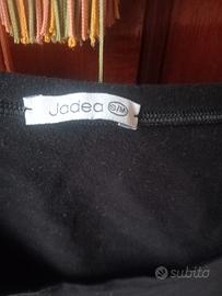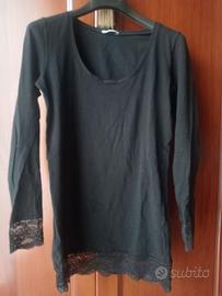 Maglia nera con dettagli in pizzo – Jadea (taglia S/M) Maglietta elegante nera a maniche lunghe del brand Jadea, perfetta sia per look casual che più raffinati. Presenta scollo ampio e femminile e bellissimi dettagli in pizzo su polsini e fondo, che la rendono particolare e delicata. ✔ Taglia: S/M ✔ Colore: nero ✔ Tessuto: 95% cotone, 5% elastan (morbida ed elasticizzata) ✔ Vestibilità: aderente ma comoda ✔ Condizioni: buone, senza difetti evidenti Ideale da abbinare a jeans, gonne o sotto una giacca per un outfit chic.