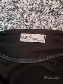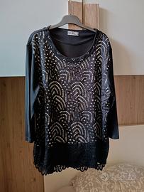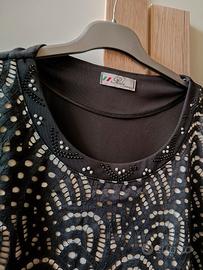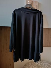 Raffinata maglia nera a maniche lunghe firmata Perla by Gherardi, autentico Made in Italy. Un capo che unisce comfort ed eleganza grazie ai suoi dettagli ricercati. Il design: Il pannello frontale presenta una splendida lavorazione traforata a motivi geometrici/ventaglio, sovrapposta a un fondo bianco a contrasto che ne risalta il disegno. Dettagli preziosi: Lo scollo rotondo è impreziosito da piccole applicazioni di castoni e perline nere che donano punti luce discreti. Finiture: Fondo rifinito con bordo in pizzo macramè smerlato, molto elegante se lasciato cadere sopra un pantalone a sigaretta o una gonna dritta. Vestibilità: Linea fluida e leggermente svasata (stile tunica), molto confortevole. Dettagli: Marca: Perla by Gherardi Condizioni: Ottime, pari al nuovo. Taglia: L Occasione: Cerimonia, ufficio elegante, serata.