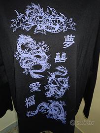 maglia nera unisex, vestibilità over, disegni di draghi viola, spalle cm 60 lunghezza 70