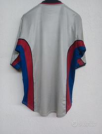 Maglia da trasferta del Barcellona, stagione 1998/1999, prodotta dallo sponsor tecnico Nike. La divisa, dal colore grigio con dettagli in blu e rosso sulle maniche e su i lati, sul petto spiccano lo stemma del Barcellona cucito e il logo Nike ricamato in rosso. Realizzata in tessuto tecnico per garantire prestazioni e comfort