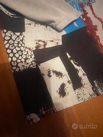 Maglia da donna, sul davanti a fantasia rosso, blu, nero, grigio, arancione. Dietro in tinta unita grigio-celeste. Mara Laura Torelli per NKD, 100% poliestere. Misura 44-46 (c’è scritto), ma vedere anche le misure: da spalla a spalla cm 45, da ascella ad ascella cm 59, lunghezza cm 70,5. NUOVA, ancora con etichetta, svendo