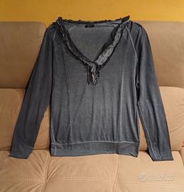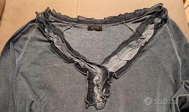 morbidissima e leggera maglia elasticizzata colore blu denim con scollo a V impreziosito da voulant