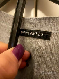 maglia Phard misura M con chiusura asimmetrica al libretto con bottoniverso parte sinistra, davanti da due lati due tasche, su quella destra tavoletta del metallo con scritta "Phard". si due lati davanti dalle spalle scendere al petto e finire intorno le tasche decorazione con pietre Swarovski neri.manica con polsino alto di 10 cm.dietro sulla schena decorazione con volto della donna e scritta"Phard" fatto tutto di pietre Swarovski