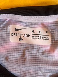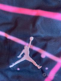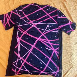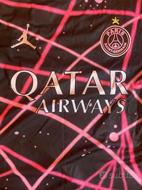 Vendo maglia del Paris Saint-Germain, modello speciale Jordan, nera con colori: rosa/fucsia in stile linee e schizzi futuristici.