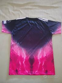 Fronte: Logo Adidas sul petto sinistro Stemma ufficiale del Real Madrid sul petto destro Sponsor Emirates Fly Better al centro Strisce Adidas bianche sulle spalle Design: Fantasia molto scenografica con effetto galassia/fiamme — sfumatura dal nero/viola scuro in alto al rosa fucsia acceso in basso Schizzi bianchi e rosa che ricordano stelle o scintille Il retro è identico al fronte, senza nome né numero Materiale: Tessuto lucido, probabilmente poliestere tecnico⚠️ Nota: Questa non è una maglia ufficiale Adidas/Real Madrid da negozio autorizzato — il design "galaxy rosa" non è mai stato prodotto ufficialmente. Si tratta certamente di una replica fan-made.perché va descritta onestamente come replica/maglia non ufficiale.