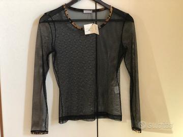 Maglietta retinata nera trasparente, manica lunga e scollo a girocollo.