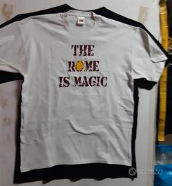 la maglia è in cotone 100%, bianca con scritta bordeaux "THE ROME IS MAGIC" e lupa, mai usata , tenuta per ricordo, taglia L, unisex, anni "80 UR