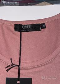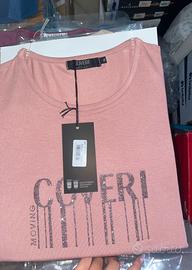 Maglia da donna marca Coveri Moving, colore rosa cipria con scritta glitterata sul davanti. Taglia XL (veste comoda).