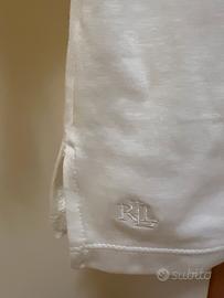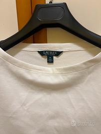 Maglia elegante, scollo a barchetta Ralph Lauren, taglia M bianca con il particolare dei fiocchi in cannetè bianche e blu a righe alla fine delle maniche, un po’ lunghette.