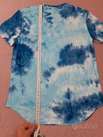 Maglietta con un vivace motivo simile al tie-dye nei toni blu, azzurro e bianco ghiaccio.
