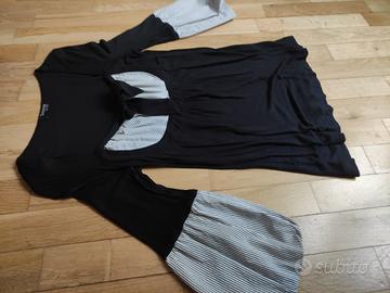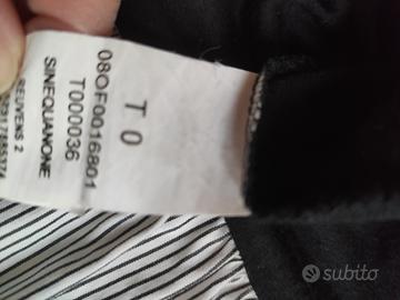 Maglia da donna, marca Sinèquanone. La maglia è a manica a tre quarti con maniche che finiscono a sbuffo di un tessuto tipo camicia di colore bianco e nero a righe. Il resto della maglia è in morbido cotone di colore nero. Stessa fantasia a righe ripresa sul petto con fiocco. Taglia O (una s/xs).