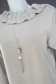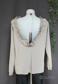 Maglia in grigio perla con ampio scollo sulla schiena.Condizioni pari al nuovo.Tessuto elastico in 95% Viscosa e 5% elastometro.Taglia riportata sul capo TU(taglia unica).Veste una 46/48.Vedi misure...