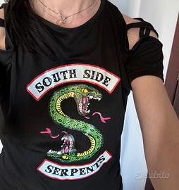Maglia nera con stampa South Side Serpents e dettagli sulle spalle. Design con spalle scoperte e lacci