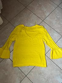 É una L ma veste come una M (veste piccolo) Maglia color giallo acceso, super luminosa 💛 Tessuto leggero con lavorazione traforata a motivo zig-zag. Maniche 3/4 con dettaglio a polsino svasato, molto originale. Vestibilità comoda, ideale per primavera/estate o mezze stagioni. In ottime condizioni, usata poco. Facile da abbinare a jeans, gonne o pantaloni eleganti ✨