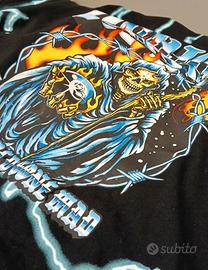 T-shirt a manica corta con stampa frontale grande raffigurante un teschio mietitore con falce, fiamme e dettagli effetto elettrico su tutta la maglia.