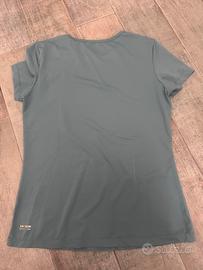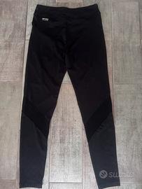 Maglia tecnica turchese a manica corta e leggings coordinato, ideali per ogni tipo di attività fisica. I pantaloni sono una S, la maglietta sfiancata e in tessuto traspirante é una taglia M. Entrambi vestono comodamente una taglia 42
