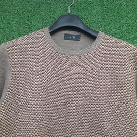 Design Unico: Il pannello frontale presenta una raffinata lavorazione micro-pattern a nido d'ape tricolore (taupe, panna e ruggine), che crea un contrasto elegante con le maniche e il retro in tinta unita beige melange.
