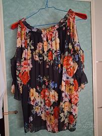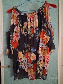 maglia in voile plissettata in vita..fantasia floreale...taglia s/m...manica al gomito con spalle scoperte...morbida e leggera