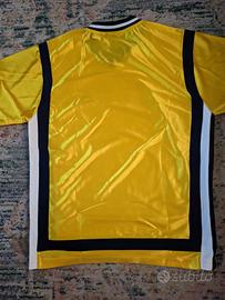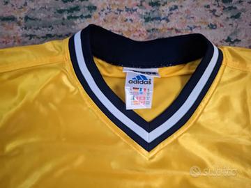 Splendida maglia vintage firmata Adidas Performance Teamwear, originale della fine degli anni '90 / primi anni 2000. Caratterizzata da un tessuto lucido e vibrante di colore giallo oro, con dettagli a contrasto su colletto e bordi.