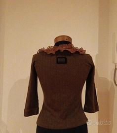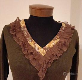 maglia vintage Dolce & Gabbana anni 90 in una calda tonalità marrone. Presenta un elegante scollo a V bordato con raso con motivo floreale e con balze