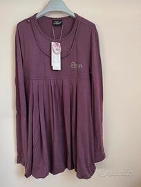 Maglia a maniche lunghe di colore viola con effetto palloncino, girocollo e particolare di perlina in alto sulla spalla + scritta Datch con brillantini