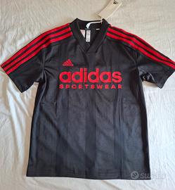 Maglietta adidas nera e rossa da ragazzo. Materiale in jersey.